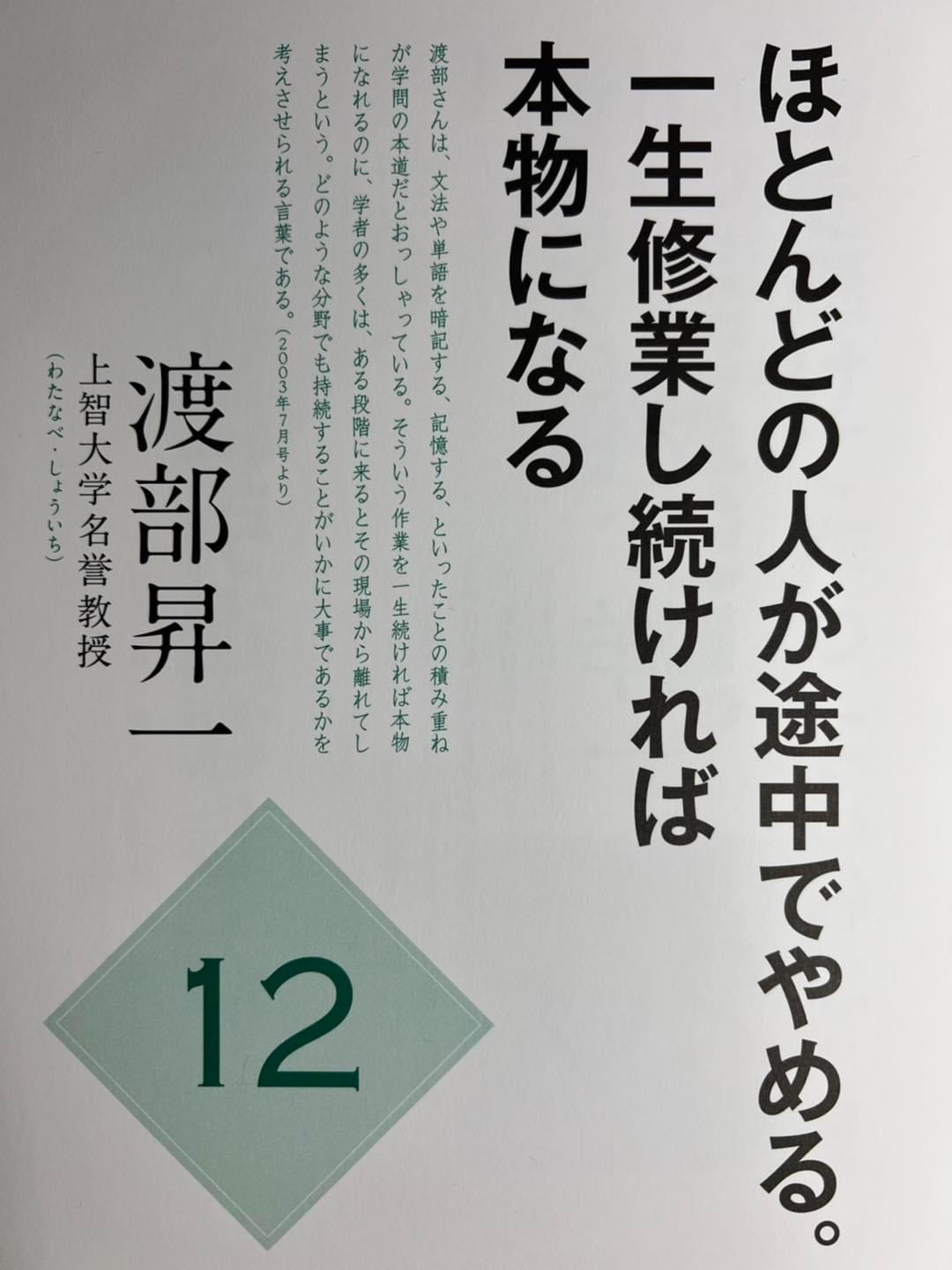 《渡部さんは、文法や単語を暗記する、記憶する、といったことの積み重ねが学問の本道だとおっしゃっている。 そういう作業を一生続ければ本物になれるのに、学者の多くは、ある段階に来るとその現場から離れてしまうという。どのような分野でも持続することがいかに大事であるかを考えさせられる言葉である。》(渡部昇一/上智大学名誉教授)